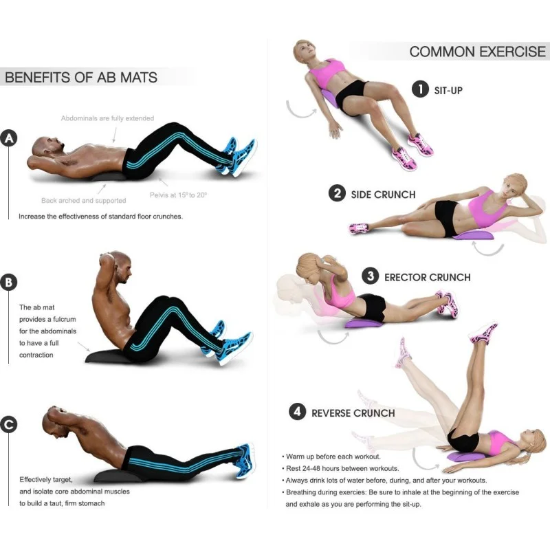 AB MAT omurgayı doğal şekilde bükerek karın kaslarının uzamasını sağlar. Bu sayede daha etkili bir egzersiz gerçekleşir. Tüm abdominal kas gruplarının yanında arka bacak kalça ve bel bölgesi kasları için de pek çok egzersiz yapabilirsiniz. Yapılan egzersizlerde hareketten maksimum fayda sağlamak için tasarlanmıştır. Kolay taşınabilir. Montaj gerektirmez. Her yüzeyde kullanılabilir. Sırtüstü , oturma pozisyonu ve diğer egzersizlerde optimal rahatlık ve hareket kolaylığı için kontürlü tasarım.